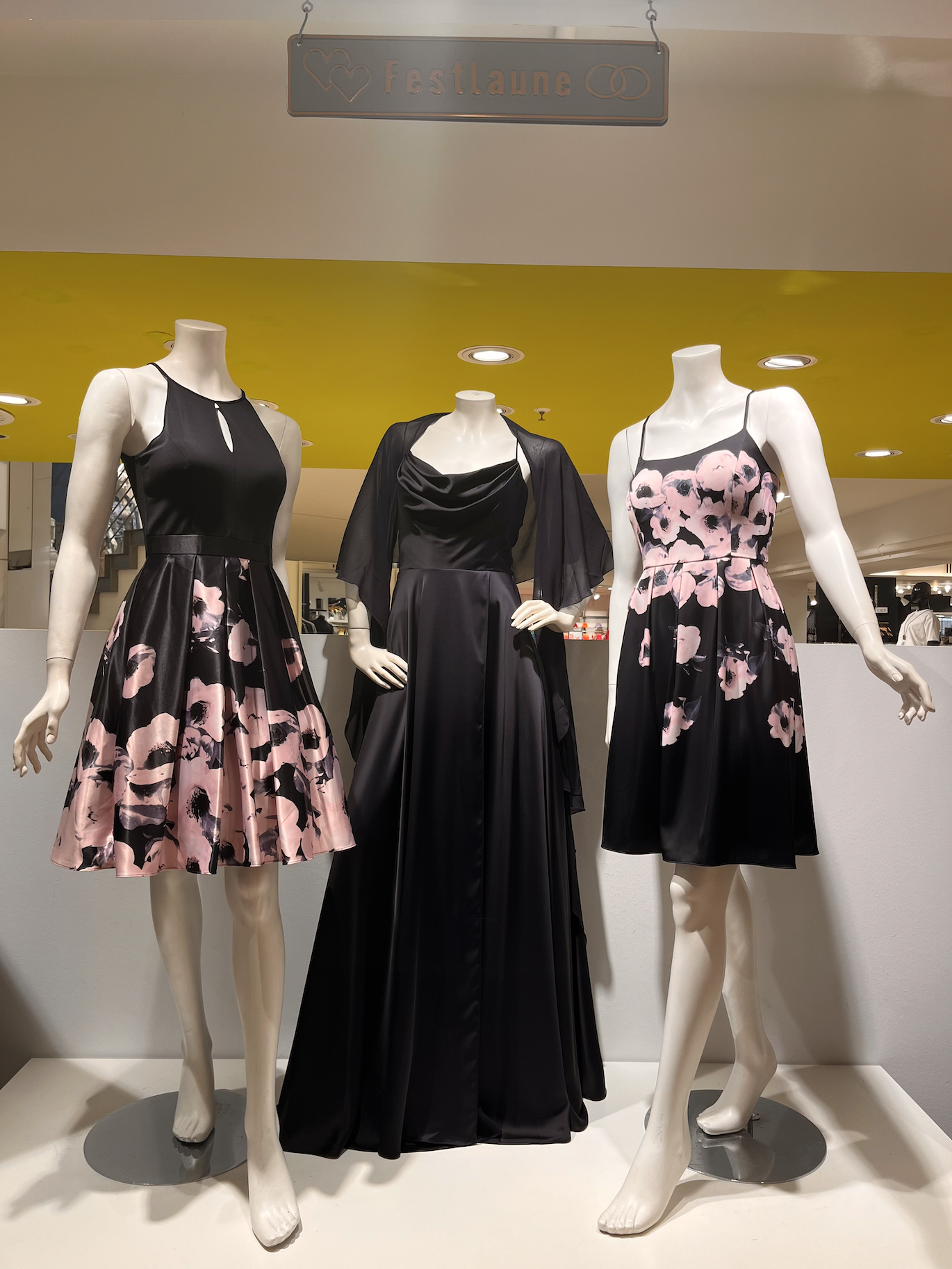 Im Untergeschoss findet die Frau eine große Auswahl an Kleidern, Overalls oder Hosenanzüge, für ihren großen Auftritt, egal ob auf Cocktail Partys, Hochzeiten oder anderen Festlichkeiten.